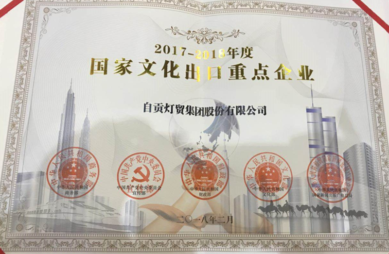7月26日,四川省“國家文化出口重點企業(yè)”授牌儀式在省商務廳三樓會議室隆重舉行,自貢燈貿集團股份有限公司再次入選“2017-2018年度國家文化出口重點企業(yè)”,是全國唯一連續(xù)六屆十二年獲此殊榮的彩燈企業(yè)。