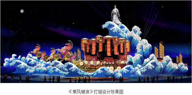西區(qū)湖面上,長65米,高22米的主題燈組“乘風破浪”是本屆廟會中的“巨無霸”,利用現(xiàn)代燈光技術(shù)以獨特的藝術(shù)手法展現(xiàn)了三國時期的著名戰(zhàn)役——赤壁之戰(zhàn)。一幕精彩的三國故事圖卷將在波光粼粼的湖面上徐徐鋪展。